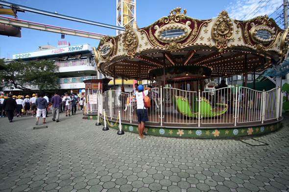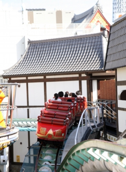为庆祝古稀之年过山车上涂满了红色,车身上写着[祝•还历]的字样。 浅草花屋敷游乐园里最具历史的游乐设施是惊魂屋。 令人怀念的旋转木马深受携家人前来的游客们的喜爱。 令人眷恋的打靶场 游乐园里有一个庙会角,在有庙会的日子一定会有打靶场,那些第一次体验打靶游戏的小朋友们,很快就玩得入了迷。 大人或一家出行的人们,也很兴致勃勃地玩着各种出现在昔日庙会上的游戏节目。 花舞台在花舞台上,经常举办舞蹈和演剧、以及职业摔跤等各种活动,到访者中还有不少拖家带口的海外游客。 为庆祝古稀之年过山车上涂满了红色,车身上写着[祝•还历]的字样。