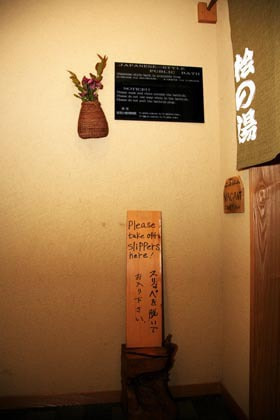 浴場の入口にも、スリッパを脱いで入って下さいと、日本語、英語の手書きの札が立て掛けられています。