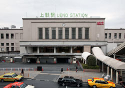 上野車站從鐵路黎明期的明治16年(1883年) 開始營運,是最早的一條日本私鐵鐵路,也就是上野到熊谷之間路段的起點。到了明治39年(1906年),根據當時施行的「鐵道國有法」被收歸國有,成為前往東北、上越方向列車的起點站,也被稱為「北方的玄關站」而逐漸發展至今。昭和62年(1987年)由於日本國有鐵路(國鐵)分割民營化的關係,變成了東日本旅客鐵道株式會社(JR東日本)的上野車站,一直持續到今天。現在包括JR東日本、地下鐵東京Metro(東京地下鐵)銀座線、日比谷線都在此交會。昭和2年(1927年),連結上野、淺草之間的銀座線開始營運,也是亞洲最早的地下鐵路線。(台東區上野7丁目)