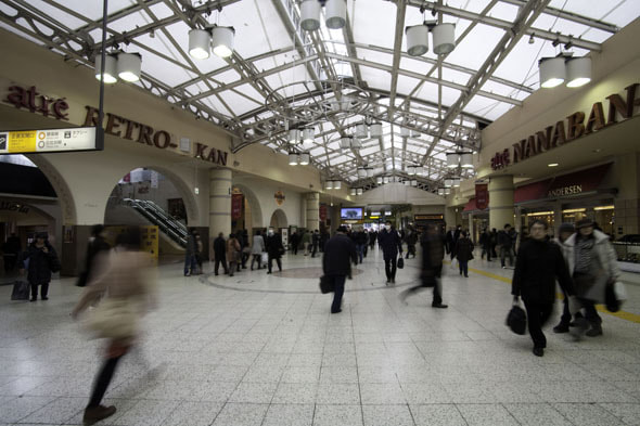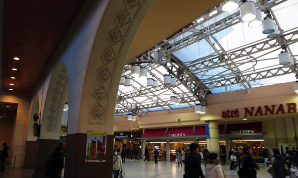중앙광장의 양측에 들어선 쇼핑몰과 음식거리 등의 복합시설이 역 안에 활기를 띠게 합니다.