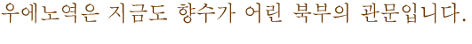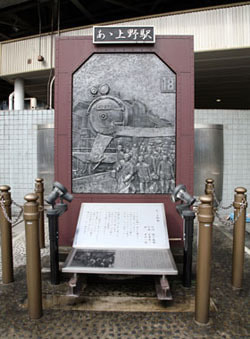 우에노 히로코지 출구 옆에는 「아 우에노역」(작사: 세키구치 요시로, 작곡: 아라이 에이이치, 노래: 이사와 하치로)의 시비가 세워져 있습니다. 고도 성장기였던 1955년부터 70년대에 걸쳐, 당시 황금알이라 불리던 집단취업 젊은이들이 우에노역으로 내려섰습니다. ‘어딘가로 고향의 향기를 싣고 타는 열차의 그리움... ‘이란 가사에서 당시 집단취업 젊은이들의 고향을 그리는 모습이 되살아납니다.