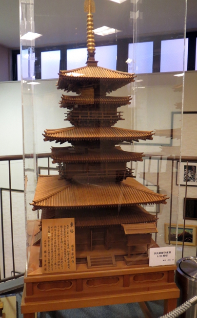 これらは木工細工で、主に製作されているのは神輿などですが、これは奈良薬師寺の東塔の縮小模型です。