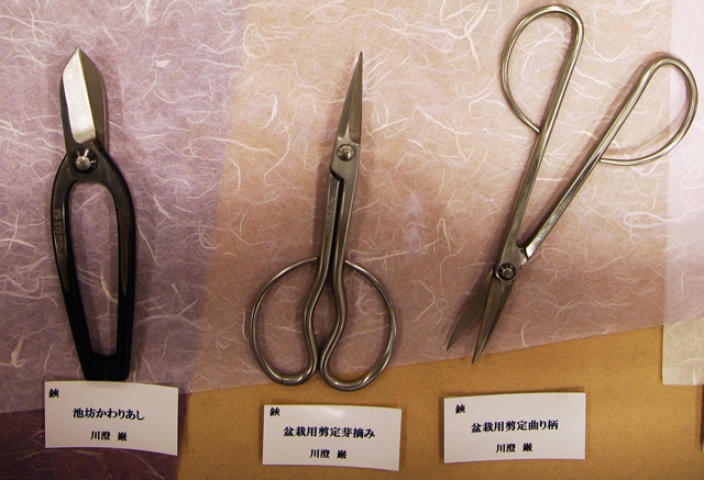 昔は、洋裁学校などでも、ずいぶんラシャ鋏などが使われていたのですが、最近では需要も無くなりました。これらは植木や花の剪定鋏ですね。 (右段に続く)