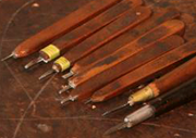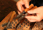 現在使用的這是雕刻刀,也叫小刀,用這樣一把小刀能完成整體工作的7成,因為所有的線都是用這個刻出來的,最後再用鑿子完成剩下的3、4成,所用的工具是比較少的,圓鑿子3把,平鑿子2把,也就是這些了,加上小刀1把,和7、8把清理鑿子。