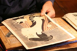 木版畫就是印在木版上的畫。進入江戶時代以後,伴隨著浮世繪的登場木版畫也得到了急速地發展。繪畫師、雕刻師、染色師的分工形態就是在這個時代産生的。