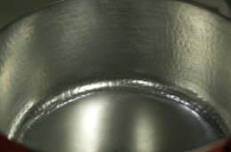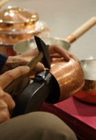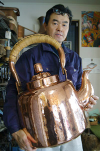 是啊,在燃氣普及以前,我們制作了很多的鍋和內爐等。曾經還有一段時期,制作的全部是燙酒銅壺,是一種用銅制鍍鎳的燙酒容器。鳗魚店裏用的稱做鳗銅壺,下面應該是有烤鳗魚的地方,熱量傳到旁邊的水箱把水燒開後用來燙酒。這種燙酒銅壺現在也已經改成不鏽鋼的用機械制造的了。不做燙酒銅壺了以後,好像就開始制作茶具和蛋卷平鍋等小器具了。從前一到夏天做燙酒銅壺的工作比較閑的時候,才會制作一些這樣的小東西,現在卻以制作這些爲主了。