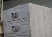 這種燒過之後再上色的手法叫做“制作時代感”,其他的工作室把這種技法叫做燒桐,在東京我們家是始祖,這個名稱是從樂器筝上借鑒來的,本來是在做筝的時候先是要用火烤一下的。我的祖父從那裏得到啓發,他是第一個嘗試著用噴燈烤的方法來制作衣櫃的人。這種增加時代感的加工技法,從戰後開始已經有50到60年了。