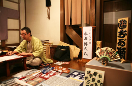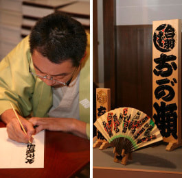 有从木制招牌店过来的业务,在大招牌•小招牌•敬奉匾额等上面刻写人名或企业名称。也在手巾和夏天穿得单和服上写街道名称或同好会的名称,也设计日式棉袄上的徽章。在做扇子的纸上直接写上字后制作出来,能够表达的东西有很多。因为是写在制作好的现成产品上的字,所以字体能够保持原来的大小,不会因为缩小尺寸而使字体破坏。