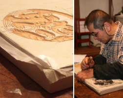 根据订单要求的尺寸裁截板子,然后把用机器印刷的和纸用海苔浆糊贴上打底,再在上面贴上写有文字的衬纸后进行雕刻,从准备到完工全部是手工作业。现如今如果不是用机器印刷的和纸的话,就不能保证所需要的纸的薄度,手工纸的话因为韧性太强从板子上往下揭的时候会粘在一起,和纸是用海苔浆糊贴在板子上的,韧劲过强会揭不下来,没有韧性又会容易破,活儿做不漂亮。因此如何控制海苔浆糊的量是其关键。从前一般会将和式的线装书拆散,用里面的和纸。