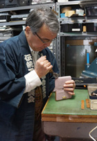 我是一边研究着江户时期使用过的箱包进行制作的。本来我这里是专制香烟包的,也做像巾着袋(注,类似中国的荷包,香囊的小口袋,开口处有两根反向的绳左右一拉就可以收紧,两只手各执袋口向外一扩又能打开。)和合切袋那样能手提的包,主要是选择一些能营造出江户气氛的东西来制作。