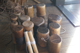 除了用竹子以外,还用芦苇、鼠曲草、宽叶香蒲、胡枝子等编帘子。材料当然是有适合和不适合之说,最好根据用途选择使用。比如把竹子劈开后来做成竹签。因为是竹子可以用刀削出适合的形状。像做紫菜卷用的竹帘,卷的一边作成平的,手握的一边做成鱼糕似的圆拱形,做鸣门卷和圆筒状鱼糕等锯齿状的东西时用三角形的帘子会比较适合。对于其他材料的话,几乎都是在植物的自然状态下直接拿来使用,不用像竹子那样进行加工。胡枝子可以作出漂亮的颜色和光泽,但因其比较纤细都是弯着的,要把它用火矫直以后手感才会好。但是用火矫正过的东西一淋雨就不行了。