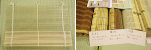 基本上是客人需要什么我们做什么。主要分成4大类,首先是在室外挂的竹帘,主要用做防晒或防视线。其次是挂在室内的竹帘,在神社佛阁中使用的御帘(帘子的敬称)以及日式房间里用的帘子都包括在内。现在也有挂在窗户上当窗帘的帘子。其他还有一些小帘子,像做紫菜卷用的,还有更小些的放日式点心用的托盘等。最近也有当作用餐垫和杯垫的小帘子。还有就是部分运用的了,比如有在屏风上挂帘子的,还有把帘子糊在推拉门上的等等。再有就是根据客人的具体需要告诉我们在哪些地方上需要用,我们就按要求给他们做,类似这样有特殊需求的制作任务还为数不少呢。