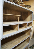 这种烧过之后再上色的手法叫做“制作时代感”,其他的工作室把这种技法叫做烧桐,在东京我们家是始祖,这个名称是从乐器筝上借鉴来的,本来是在做筝的时候先是要用火烤一下的。我的祖父从那里得到启发,他是第一个尝试着用喷灯烤的方法来制作衣柜的人。这种增加时代感的加工技法,从战后开始已经有50到60年了。