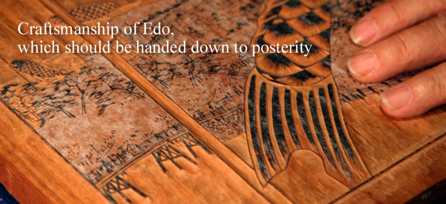 As for Ukiyo-e in the Edo Period, colors are exactly determined. For example, when you look at representations of flowers, you can quickly discern whether they are finished in the Kanto or Kansai Region. Prints are more skillfully printed in the Kansai Region. Flowers are softly represented. A way of pressing "Baren," or disk-shaped pad, is different. It makes the difference. As far as Ukiyo-e is concerned, there is less difference in engraving techniques than in printing techniques. The techniques differ greatly between different masters. There are about 10 fellow woodblock engravers, but when we meet together and talk about engraving techniques, it turns out that our techniques differ according to our masters. Tools and ways of engraving are little bit different among us. Ways of sharpening chisels also differs.