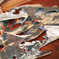 First of all, I draw a pattern, and carve it out. Next, I use a file for scabbling shells. The file is called "Gangiri" and only used by tortoiseshell workers. To begin with, I remove scratches on the surface with Gangiri. Then, I remove scratches made by Gangiri with a penknife, and polish the shells with horsetail leaves after sandpapering them. After that, I press them using heat and water.