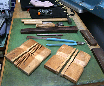 For example, pouch craftsmen use Yosenen to round off corners of a pouch. It is an important tool. There are also knives that are used to cut leather. I use those knives to cut leather according to paper patterns. I also use rollers to finish pouches. The rollers are useful to firmly paste leather. I had mainly used hammers before, but rollers are more useful when pasting leather together with even pressure.