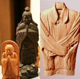 右)木彫の上着 、大川さんのユーモアが溢れてます。