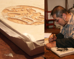 墨文字が浮き出て立体的に見えように彫るのが『かまぼこ彫り(額彫り)』。その他に石屋さんが墓石に彫るような丸く文字を彫る『石屋彫り』、平らに彫る『地すき』、周りから彫って立体感を出す『篆刻(てんこく)』、溝をV字型になるように彫る『薬研(やげん)彫り』が主な彫り方です。篆刻などは素人さんでも彫れるんですが、彫り下げるという作業は、素人さんにはなかなかできないんだよね。