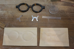 안경의 경우는 우선 옥형이라고 하는 렌즈의 틀을 만듭니다. 주문 받을 때 도매상에서 사이즈 요청이 옵니다. 그것에 맞춰서 플라스틱 시트로 형을 만들고 코와 옆 부분, 그리고 똑바른 막대, 위와 아래 부분을 만듭니다. 그리고 형에 따라서 재료를 실톱으로 잘라갑니다. 그러면 두껍고 얇아야 하는 부분이 있기 때문에 몇 장을 붙여서 원하는 두께가 되도록 부품을 만듭니다. 붙일 때는 접착제를 사용하지 않고 물과 열과 압력을 이용해서 판에 끼워 압축합니다. 그리고 붙이기 전에 재료를 봅니다. 재료를 불빛에 비춰가면서 어디를 어떻게 잘라낼지 생각하고 색이 맞도록 잘라냅니다. 이 때 낭비 없이 잘라내는 것이 매우 중요하지요.