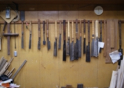 이렇게 태운 다음에 색을 입히는 작업을 ‘지다이시아게’(시대 마감)이라고 해서 다른 공방에서는 ‘야키기리’ 등의 호칭으로도 불리지만 도쿄에서는 저희가 원조입니다. 이 명칭은 악기인 거문고에서 유래한 것인데, 원래 거문고를 제작할 때는 그을려서 합니다. 그 점에 착안해서 조부가 처음으로 장롱을 버너로 그을리고 여러 가지를 궁리하면서 시도했지요. 이런 지다이시아게라는 마감 기법은 전후부터 시작해서 5,60년 정도 되었습니다.