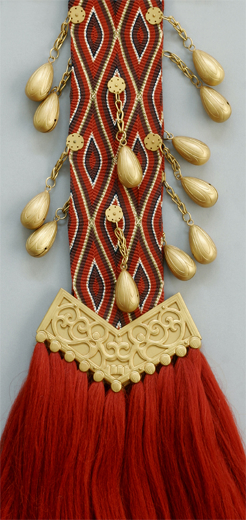 傳統的組紐圖案,有龜甲編、鐮倉編、獻納給厳島神社(位于廣島的世界遺産)的《平家納經》經卷上裝飾有厳島編的組合編、唐編、冠編、奈良編、禦嶽編、高麗編等多種多樣圖案,編制方法具代表性的達到20來種,再加上仿效和派生的編法,綜合起來可達數百種之多。其中最複雜的編法是雙面龜甲編,需要使用144個線球的量,是一般組紐用線量的3倍。(照片左側是龜甲編,右邊近處的是鐮倉編)