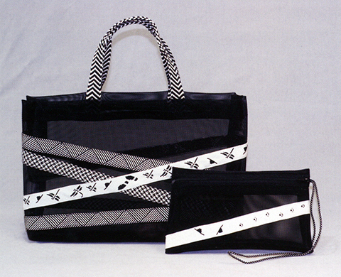 Although most works are sash bands, we sometimes make a variety of works. This is a pamphlet of our works. These bags are made by tying pieces of Kumihimo together, so it took an incredibly long time to make them.