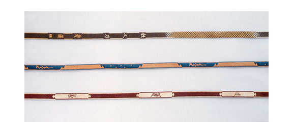 The most characteristic one is the complexity of braiding methods. Those methods were introduced into Japan in the Nara Period, and have increasingly been sophisticated and complicated. The point is that how very complex pieces of Kumihimo are braided, including those procedures.