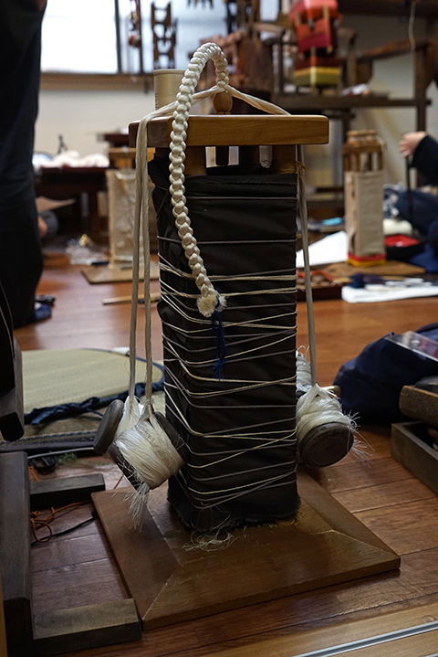 A braiding method of Kumihimo using Kakudai. A large size cord for a Japanese half-coat is being braided.