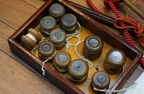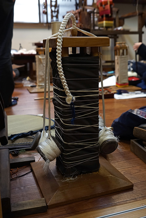 玉(たま)と言います。これは昔から使っているものですので、匁(もんめ)でやっています。一匁が3.75gですから、もっとも軽い玉で二十匁(75g)、一番重い玉で二百十匁(787.5g)程度です。大きな組紐を作る際には重い玉を用います。これはお相撲さんの羽織紐を作っていますので、二百十匁の重い玉を使って頑丈で大型の組紐を作っています。普通の羽織紐の何倍も糸を使いますね。