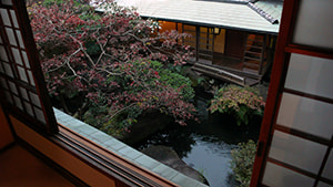 The four seasons are best represented by trees and flowers. He selected trees with white flowers, from Japanese apricots that bloom in January to sasanquas that bloom in December, and planted them in this garden. For example, deutzias, which are bushy trees, bloom bright white flowers all over the garden in May. He filled the garden with white flowers thinking that white represents purity. However, as it is often said that every tide has its ebb, he decided to plant one crape myrtle that blooms red flowers in summer. It is the reason why just one crape myrtle was planted. I think the appeal of white in nature is well expressed. This room was used as Asakura's private room. This "Funazoko Tenjo," or wooden ceiling shaped like a ship's bottom, is made of semipetrified Japanese cedars. While such a high-grade material is used, there is a utensil rack for tea-things. The rack was also created by him. Although the materials were not so luxurious, he made such a rack combining Chinese shelves and other materials. The frames of the shoji screens are handiworks, which were made by craftsmen. They were created with softened goma bamboos and square timbers inserted in the bamboos' hollow centers. Although this is his room, I think he created intriguing things by combining elaborate craftworks and daily commodities, such as duster's handles that were audaciously fixed on the shoji screens, which he conceived of in his daily life. A pottery wheel was placed here, so he used to take a seat around here. There is also a picture in which he looks at the pond in summer while leaning against this pillar.