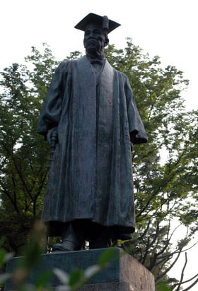 Q: 大隈重信像は、実物よりずいぶん大きいようですが。