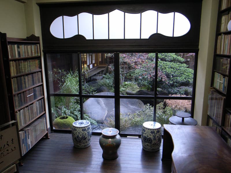 仁・義・礼・智・信にちなんだ巨石が配された五典の水庭に面した数寄屋造りの日本建築では、海外からの来客をもてなした西洋風の設えられた応接間に並んで 和風の茶室や自室が配置されていて、まさに和と洋が同居した世界となっています。中庭では白を基調とした草木の中に一本だけ百日紅(さるすべり)の赤い花が配された様は、清新さを表していて、いかにも白いキャンバスに紅一点の色が置かれたようにも、また彫刻に用いられる大理石か石膏の白さを意図したようにも感じられます。
