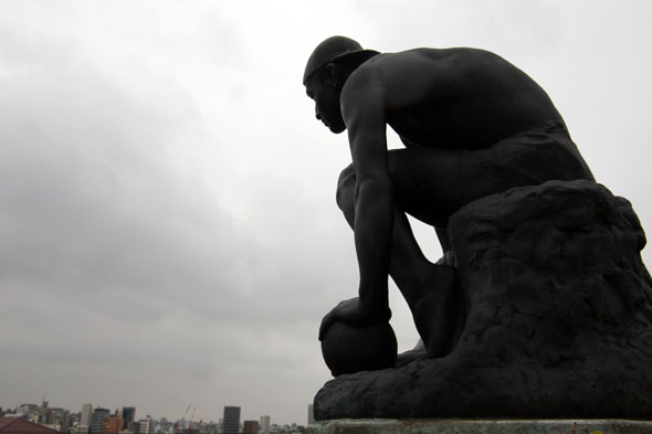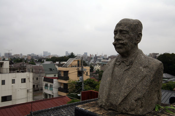 在工作室楼的屋顶上摆放着雕塑作品,雕像和放眼望去的谷中街景,创作出了一个很大的空间。