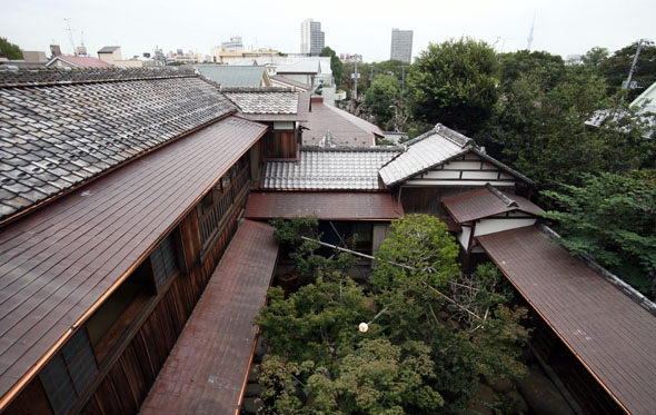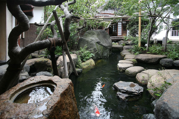 The characteristics of the courtyard are that it has the unusually deep pond that goes beyond common sense in garden making and that several massive rocks are placed in it. "Sakuteiki," or records of garden making, which was written in the Heian Period and has been the basis of garden making, says that a pond in a garden should be shallow. It is said that, if a pond is deep, fish grow too big. From the first, water has welled up in the Yanaka area, so Asakura designed the garden making use of the water. The deepest part of the pond is more than two meters deep. The stepping-stones on the pond are supported by an arch-like structure made of concrete. Fish swim under the structure. Now, there are about 20 carp and 180 crucians. In his essay, Asakur wrote that he purchased carp from Niigata Prefecture. (continued in the upper right column)