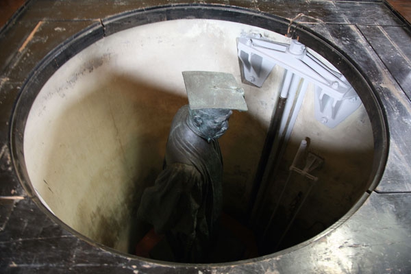展示方法については、アトリエにあります大作の制作に用いていた昇降台を修復して起動するようにしましたので、出来れば、これを用いた展示を行いたいと考えています。昇降台は、大作を制作する際に電動で上下する彫塑台ですが、その際にはこのようにしていたという事を示せるようにしたいと思います。昇降台を作るにはコンクリート建築にしないと建物が耐えられないという事で、朝倉はあまり好まなかったのですが、コンクリート造りとしたという話でした。また、これまで昇降台については蓋をしたままでしたので、今回見て頂けることは、朝倉の創作の一面を知って頂く良い機会だと思います。(下段に続く)