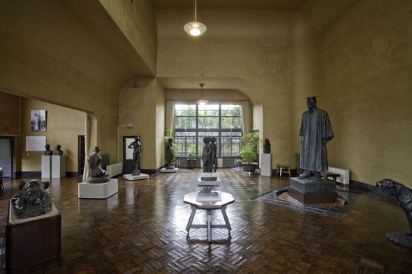 アトリエ入口には、彫塑館を守るように代表作「墓守」(明治43年(1910))が配され、大隈重信像(昭和7年(1932)、早稲田大学構内に設置)、知・情・意を表した「三相」(昭和25年(1950)、JR上野駅構内にも設置)等の代表作品が展示されています。