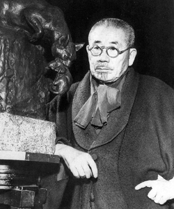 猫をモティーフとした作品「よく獲たり」を前にした朝倉文夫(図録『朝倉彫塑館』より)