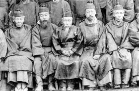 本著複興傳統的理念,身著模仿古代官服阙腋(衣服的兩側不縫,袖子以下是敞開著的)和折烏帽子(折疊烏紗帽)的制服的教官們。從左起,加納夏雄、高村光雲、黑川真賴、岡倉天心、橋本雅邦。