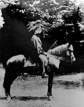 跨在愛馬若草號上的岡倉角三(天心)