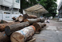 在畫室的前面,擺放著用作材料的巨大木材。