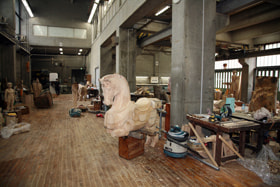 听深井教授说,学生的作品没有固定要求,可以任意作自己喜欢的东西。硕士研究生有毕业作品展,作品展示在大学美术馆和这个工作室里,因为在大学美术馆里展示雕刻作品的空间比较狭窄,作品在制作时限定于一个房间内能够放得进去的尺度,用一年的时间去制作完成。那些大到房间内都摆不进去的作品,只好展示在室外和大学美术馆前。学生们虽属于不同的研究室,但是工作室不分你我可以共同使用。深井老师的专业是木雕,在他的研究室里,有从本科3年级到博士生,石雕和金属的研究室也是一样的情况。但是在塑像专业情况略有不同,硕士研究生和本科生在不同的房间进行创作,2年级后期课程开始有选择实习课,有7成的学生使用的是规定素材。在日本,从素材上定向的比例比较高,已经形成了这样的一个教育体系。 (下段继续)