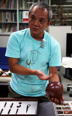 筱原教授亲自为我们展示了锻金技术的不可思议之处,随着锤子巧妙的挥动锤打,铜板像具有生命的一样随即变形。从爱沙尼亚来的硕士研究生卡高拜勒•昂尼,在本国主要从事制作珠宝首饰。而欧洲比较有人气的是木纹金(银、铜、赤铜、黄金等层积接合后一边削出纹样,一边敲打拉长的日本传统技法)。很多人来到日本本土留学学习这项技术。现在在制作容器和装饰品,珠宝加工和锻金工艺上虽然从作品的构思上存在着差异,但从爱沙尼亚的时候起他就怀有始终不变的主题。日本和欧洲在表现上存在这不同,是件很有意思的事情。