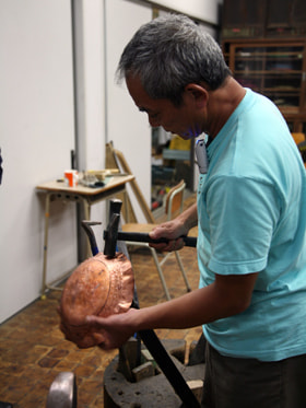 听筱原教授说,锻金技术分热加工和冷加工,前者是把铁烧红后进行锻造,后者是将退火后变软的铜板进行的冷加工挤榨技法。其他比较传统的还有着色法,就是用硫酸铜和铜绿的水溶液煮上颜色的煮色着色法,和把不同的金属板层积接合,一边削出纹样,一边敲打拉长的木纹金等技术。