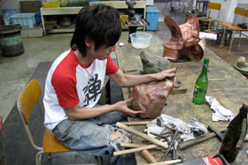 学生们能够从早晨到夜晚都专心进行自己的创作,现在,把喜欢把自己感兴趣的主题用木头制作出来的学生增多了。在教学上,先让学生自己去思考,然后讨论他思考的东西是否有意义,从而激励学生。如果只是抄袭从前的东西,当想做新的事情就会不知如何下手,让他们每个人自己去思考,看自己的雕刻观是否符合时代,是否能包含有深度的思想。另外,在素材选择上,使用最容易雕刻的,也比较容易到手的日本国产樟木。(下段继续)