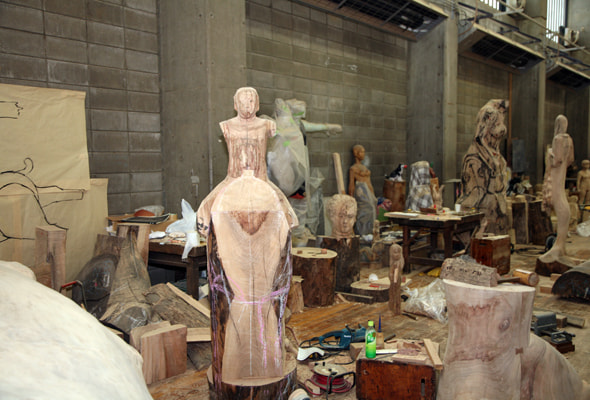 Huge pieces of wood used for sculptures are placed in front of the studio.
