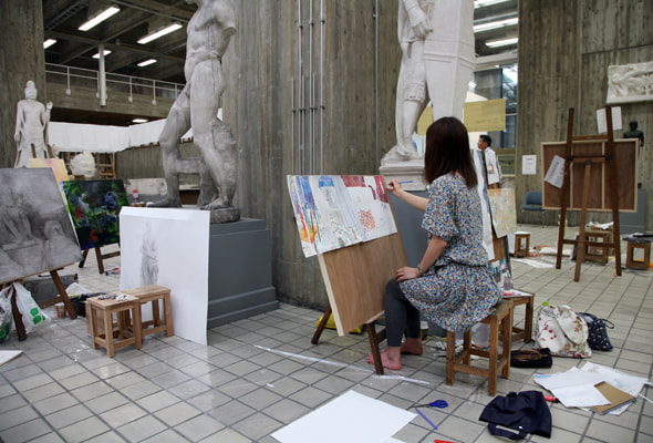 美術学部の象徴ともなっている大石膏室では、「再入試」と題された油画の授業が行われていました。林立する石膏像の空間の中で赤・青・黄・緑色のコスチュームを着た女性が、寄り添う、佇む、繰り返す、動く、集合する光景を描くという課題で、学生は5週間を掛けて石膏が置かれた空間と人体の有り様を表現していました。この授業を受けていた学生は、入学試験でも人物の存在する空間を描いており、「再入試」は、学生にとっては再び入学試験の際の緊張感や記憶が蘇るもののようでした。坂田教授のお話では、学生の多くはこれまで静止したものを描いてきているので、この授業は石膏室という空間でそれぞれ異なった動きをしているモデルの姿や絵画表現の基礎となる色彩に着目して、光・色の三原色と人物を組み合わせて描かせる試みであるとの事でした。