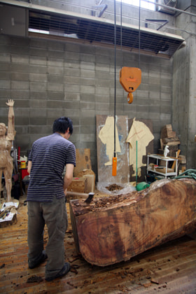 アトリエの前には、材料となる巨大な木材が置かれていました。
