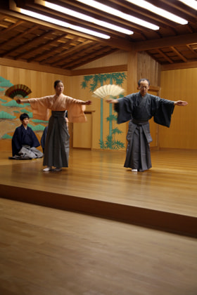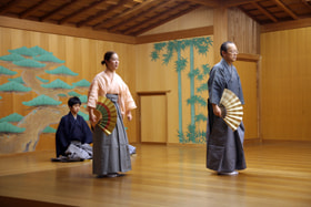 能にも新作は様々あるが、古典だけを教授しているとの事。今日では、能舞台の体裁やリズム、メロディも多少変わっていますが、能面、面(おもて)やことば、詞章は変わらずに600年間受け継がれてきたもので、自分なりの解釈は許されない。能においては、まず古典を覚える事から始まり、四十代、五十代までも我慢して古典を一通り学んだ後の六十代、七十代になってようやく表す事ができるようになる。一般に、男の場合は、素顔で出て来ておかしくない時には直面(ひためん)という面を掛けないで演じるが、女や鬼、神様の役の場合には面が用いられる。能面を掛け装束を着けた正式の演技の他には、仕舞(しまい)として、3分とか5分程度のさわりの部分のみを演技する事もある。能舞台の4本の柱には大変重要な意味があり、足が近づき過ぎると自身が弱く見え、ある程度の距離まで近づくと良い緊張感となり、またあまり内輪だけで舞うと引き締まらない。(下段に続く)