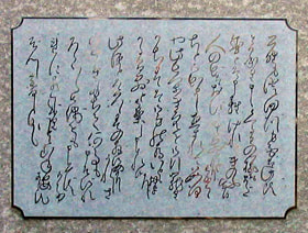 Ichiyo's monument "Tamazusa-no Hi," on which a text from unpublished letters sent to her teacher "Nakarai" are inscribed