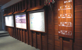 관내 1층 입구에는 류센지마치의 거리를 떠올리게 하는 정겨운 옛 건물 판자벽풍의 안내판이 있습니다.